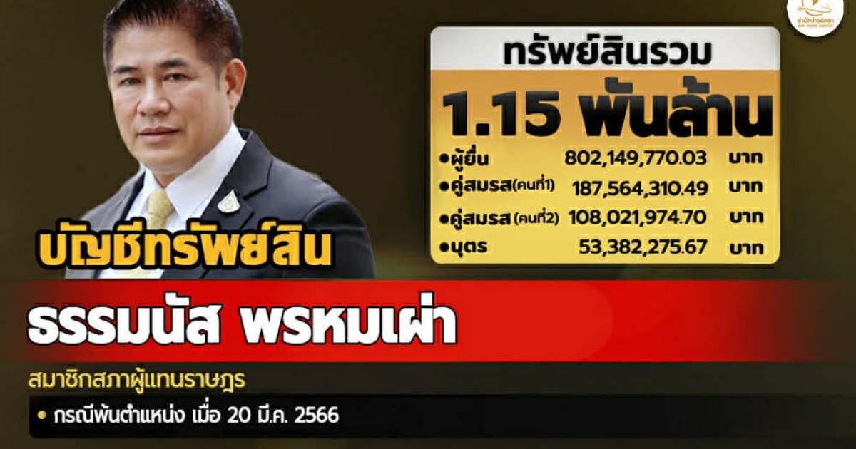 นายธรรมนัส พรหมเผ่า รองนายกรัฐมนตรีและรัฐมนตรีว่าการกระทรวงเกษตรและสหกรณ์ รัฐบาลนายอนุทิน ชาญวีรกูล ในฐานะ ประธานที่ปรึกษาหัวหน้าพรรคกล้าธรรมมีบทบาทสำคัญในการเลือกตั้ง 8 ก.พ.2569 ที่ผ่านมา สำนักข่าวอิศรา (www.isranews.org) รวบรวมข้อมูลบัญชีแสดงรายแสดงรายการทรัพย์สินและหนี้สินของนายธรรมนัส กรณีพ้นตำแหน่ง สมาชิกสภาผู้แทนราษฎร (ส.ส.) พะเยา พรรคพลังประชารัฐ เมื่อวันที่ 20 มี.ค. 2566 ตามที่สำนักงานคณะกรรมการป้องกันและปราบปรามการทุจริตแห่งชาติ (ป.ป.ช.) เปิดเผยเมื่อวันที่ 17 ก.ค. 2566 นายธรรมนัส พร้อมภรรยาทั้งสองคนและบุตรที่ยังไม่บรรลุนิติภาวะ มีทรัพย์สินทั้งสิ้น 1,151,118,330 บาท (1,151.1 ล้านบาท) ในจำนวนนี้เฉพาะเงินฝาก ประมาณ 215.14 ล้านบาท ที่ดิน 415.16 ล้านบาท เฉพาะนายธรรมนัส นางอริสรา พรหมเผ่า คู่สมรส และบุุตรที่ยังไม่บรรลุนิติภาวะ ทรัพย์สิน 1,043,096,356 บาท หนี้สิน 85,080,355 บาทส่วน น.ส.ธนพร ศรีวิราช ผู้อยู่กินฉันสามีภริยาอีก 1 คน ทรัพย์สิน 108,021,974.70 บาท