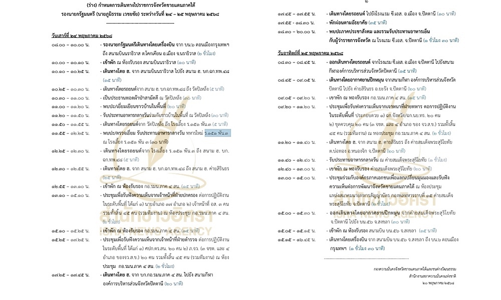 วันเสาร์ที่ 24 พ.ค.68 เริ่มตั้งแต่ 08.00 น.เดินทางจากกองบิน 6 ดอนเมือง กรุงเทพฯ ไปยังสนามบินนราธิวาส อ.เมือง จ.นราธิวาส แล้วเดินทางต่อไปเป็นประธานทอดผ้าป่าสามัคคีที่วัดปิเหล็ง อ.เจาะไอร้อง แล้วจากนั้นจึงเดินทางต่อไปตรวจเยี่ยมและร่วมรับประทานอาหารกับทหารใหม่ ร.151 พัน 3 ที่ค่ายกรมหลวงนราธิวาสราชนครินทร์ อ.เจาะไอร้อง