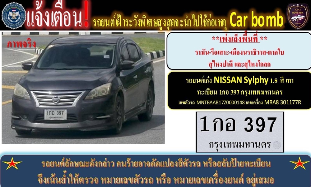จากการตรวจสอบข้อมูลของเจ้าหน้าที่ยังพบว่า รถยนต์เก๋งคันนี้ เป็น 1 ใน 2 คันที่มีการแจ้งเตือนไปยังทุกหน่วยให้จับตาเฝ้าระวัง เนื่องจากเป็นรถยนต์ที่คนร้ายเตรียมนำไปประกอบระเบิดเป็น “คาร์บอมบ์” เพื่อใช้ก่อเหตุในพื้นที่ อ.รามัน จ.ยะลา และพื้นที่ อ.ตากใบ อ.สุไหงปาดี อ.สุไหงโก-ลก รวมถึง อ.เมือง จ.นราธิวาส