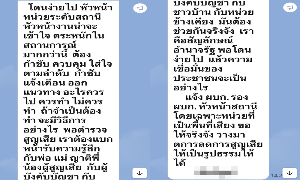 “พอตำรวจสูญเสีย เราต้องแบกรับความรู้สึกของพ่อแม่ ญาติพี่น้องผู้สูญเสีย กับผู้บังคับบัญชา กับชาวบ้าน กับหน่วยข้างเคียง มันต้องช่วยกันจริงจัง เราคือสัญลักษณ์ของอำนาจรัฐ พอเราโดนแบบนี้แล้ว ความเชื่อมั่นของประชาชนจะเป็นอย่างไร” เป็นข้อความส่วนหนึ่งที่ผู้บังคับบัญชาระดับสูงของฝ่ายตำรวจ ส่งในกลุ่มไลน์ของตำรวจชายแดนใต้ พร้อมเน้นยำให้หัวหน้าสถานีในพื้นที่เสียง ต้องจริงจังในการวางมาตการลดความสูญเสียให้เป็นรูปธรรมให้ได้