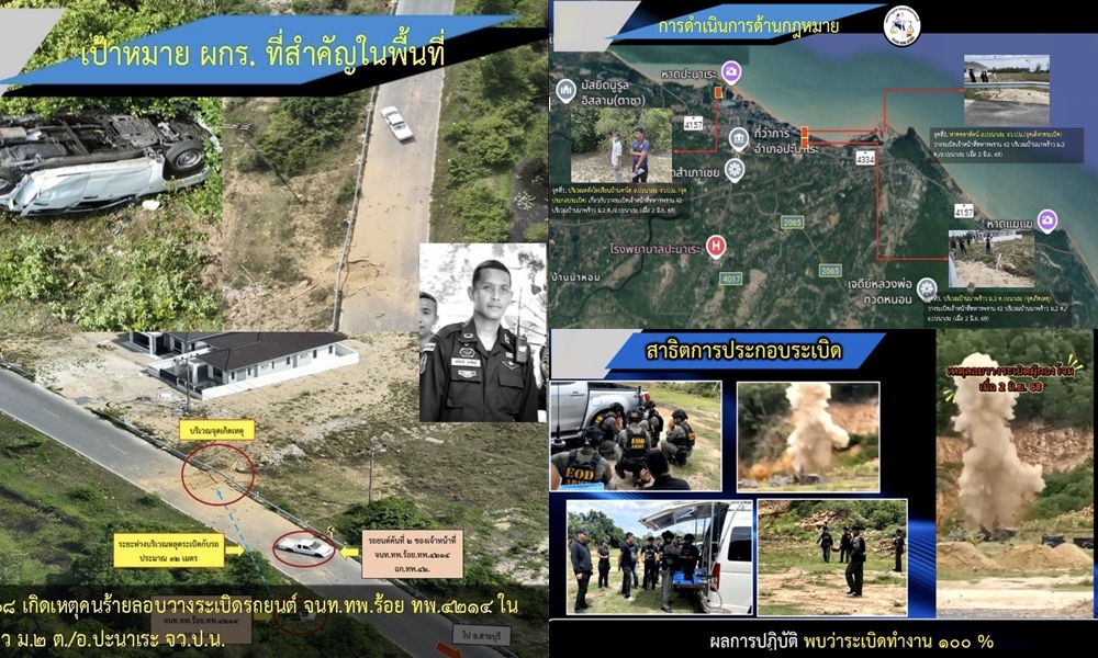 เมื่อเวลา 13.00 น.วันพฤหัสบดีที่ 10 ก.ค.68 ที่กองอำนวยการรักษาความมั่นคงภายในภาค 4 ส่วนหน้า (กอ.รมน.ภาค 4 สน.) ค่ายสิรินธร ต.เขาตูม อ.ยะรัง จ.ปัตตานี พ.อ.เกียรติศักดิ์ ณีวงษ์ โฆษก กอ.รมน.ภาค 4 สน. เปิดเผยถึงความคืบหน้าคดีคนร้ายลอบวางระเบิดแสวงเครื่อง ดักทำร้ายเจ้าหน้าที่ทหารพราน ในพื้นที่บ้านนาพร้าว ต.ปะนาเระ อ.ปะนาเระ จ.ปัตตานี เป็นเหตุให้เจ้าหน้าที่ทหารพราน สังกัดกองร้อยทหารพรานที่ 4214 หน่วยเฉพาะกิจกรมทหารพรานที่ 42 เสียชีวิต 1 นาย คือ ร.ท.อภิชาติ ผาพันธุ์ และได้รับบาดเจ็บ จำนวน 3 นาย เหตุเกิดเมื่อวันที่ 2 มิ.ย.68 ที่ผ่านมา