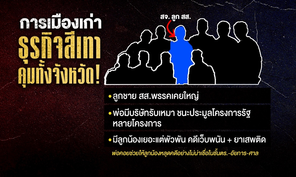 - คนที่สอง “สจ.” ลูกชาย สส.พรรคเคยใหญ่ ตัวพ่อกับแม่เลี้ยงมีบริษัทรับเหมา ชนะประมูลโครงการรัฐนับไม่ถ้วน มูลค่ารวมหลายพันล้าน ทำให้ตัวลูกชาย มีลูกน้องมากมาย ล้วนพัวพันคดีเว็บพนันและยาเสพติด แม้ลูกน้องจะเคยถูกจับ แต่แปลกที่หลุดในชั้นตำรวจบ้าง อัยการบ้าง ศาลบ้าง ทั้งหมด