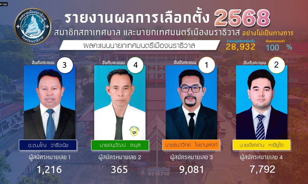 ผลการเลือกตั้งนายกเทศมนตรีเมืองนราธิวาส มีผู้ลงสมัครชิงเก้าอี้ถึง 4 ราย เรียกว่าคึกคักสุดๆ