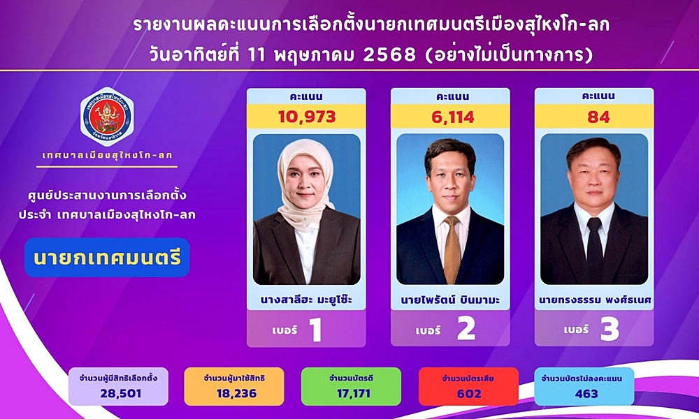 ผลคะแนนอย่างไม่เป็นทางการ ปรากฎว่า นางสาลีฮะ มะยูโซะ ผู้สมัครหมายเลข 1 ภรรยาของนายสัมพันธ์ มะยูโซ๊ะ หรือ “สส.บีลา” สส.นราธิวาส จากพรรคกล้าธรรม สามารถคว้าเก้าอี้นายกเทศมนตรีไปได้ ด้วยคะแนน 10,973 คะแนน เอาชนะ นายไพรัตน์ บินมามะ ผู้สมัครหมายเลข 2 อดีตรองนายกเทศมนตรีเมืองสุไหงโก-ลก ที่ได้รับการสนับสนุนจาก นางสุชาดา พันธ์นรา อดีตนายกฯ ที่ได้คะแนน 6,114 คะแนน