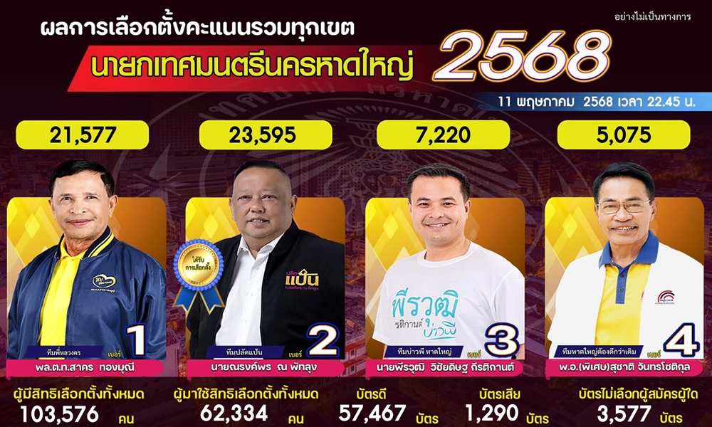 ผลการนับคะแนนอย่างไม่เป็นทางการเมื่อเวลา 22.45 น. ปรากฏว่า นายณรงค์พร ณ พัทลุง หรือ “ปลัดแป้น” ผู้สมัครหมายเลข 2 ได้คะแนน 23,595 คะแนน ทิ้งห่าง พล.ต.ท.สาคร ทองมุณี ผู้สมัครหมายเลข 1 ซึ่งเป็นอดีตนายกฯ ประมาณ 2,000 คะแนน โดยคะแนนของ พล.ต.ท.สาคร อยู่ที่ 21,577 คะแนน