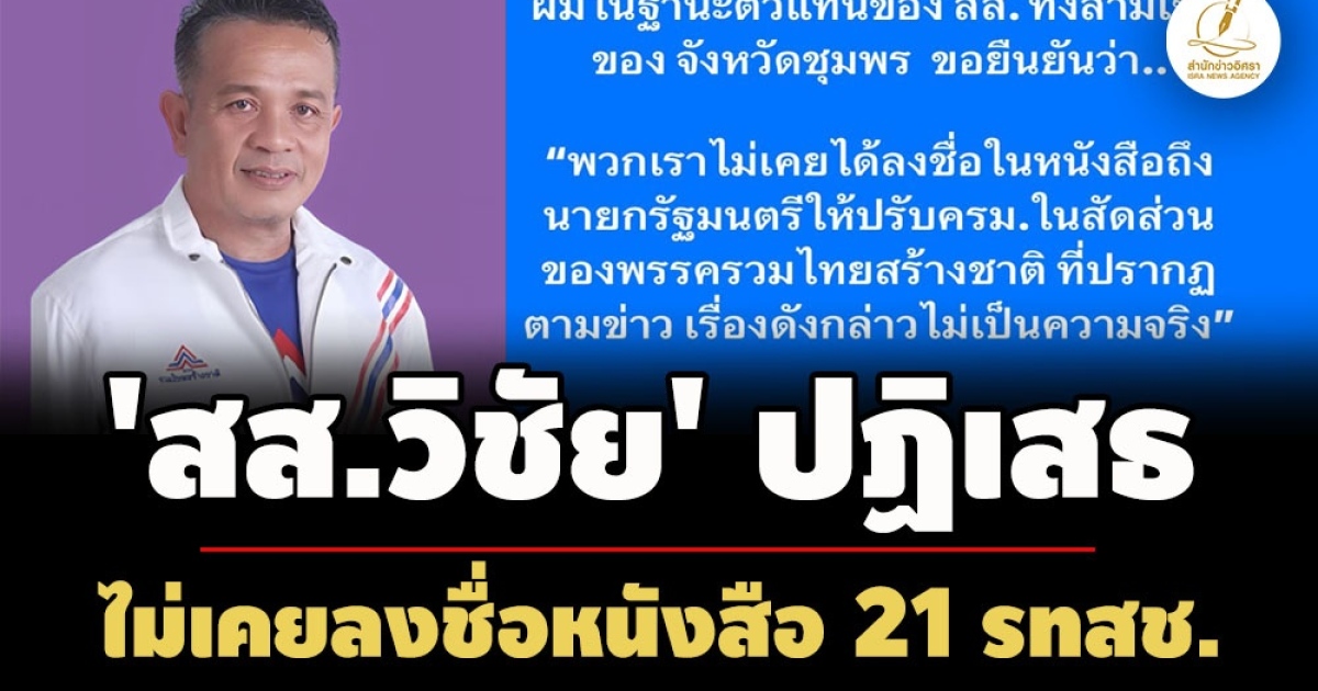 'วิชัย สุดสวาสดิ์' โพสต์เฟซบุ๊กยืนยัน 3 สส.เขตชุมพร ไม่เคยร่วมลงชื่อ หนังสือ 21 สส. รวมไทยสร้างชาติ ยื่น 'แพทองธาร' ปรับครม.สัดส่วนพรรคทุกตำแหน่ง อ้าง ขาดความรู้ความสามารถ รัฐมนตรีโดนกกต.-ป.ป.ช. ตรวจสอบเรื่องจริยธรรม - แฟนคลับแห่แสดงความเห็นชื่นชม ตั้งข้อสังเกต 2 รมต.ทำให้นายทุนพลังงานไม่พอใจใช่ไหม