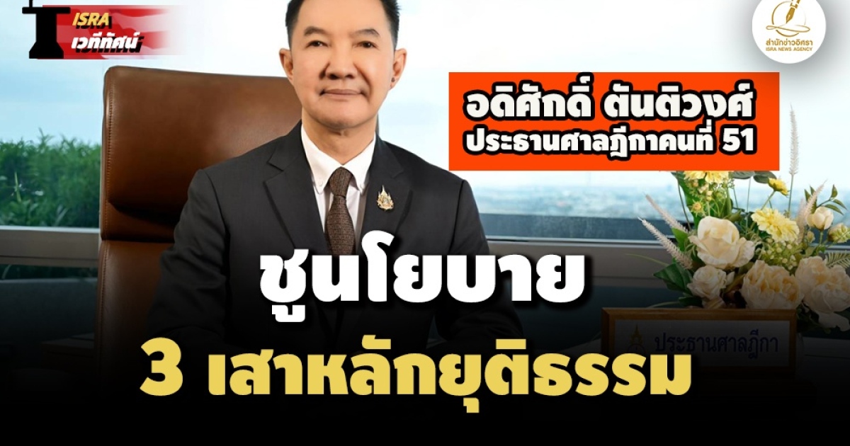 หมายเหตุ สำนักข่าวอิศรา (www.isranews.org) : เมื่อวันที่ 3 ตุลาคม 2568 เวลา 10.00 น. นายอดิศักดิ์ ตันติวงศ์ ประธานศาลฎีกาคนที่ 51 แถลงนโยบายบริหารงานยึด 3 เสาหลักยุติธรรม ‘คุณธรรมนำทาง สร้างศรัทธา พัฒนาคุณภาพ’ เพื่อเป็นแนวปฏิบัติแก่ผู้พิพากษา ข้าราชการ และบุคลากรศาลยุติธรรมทั่วประเทศ ประจำปี 2568-2569 ร่วมพัฒนาองค์กรศาลยุติธรรมให้ยั่งยืน