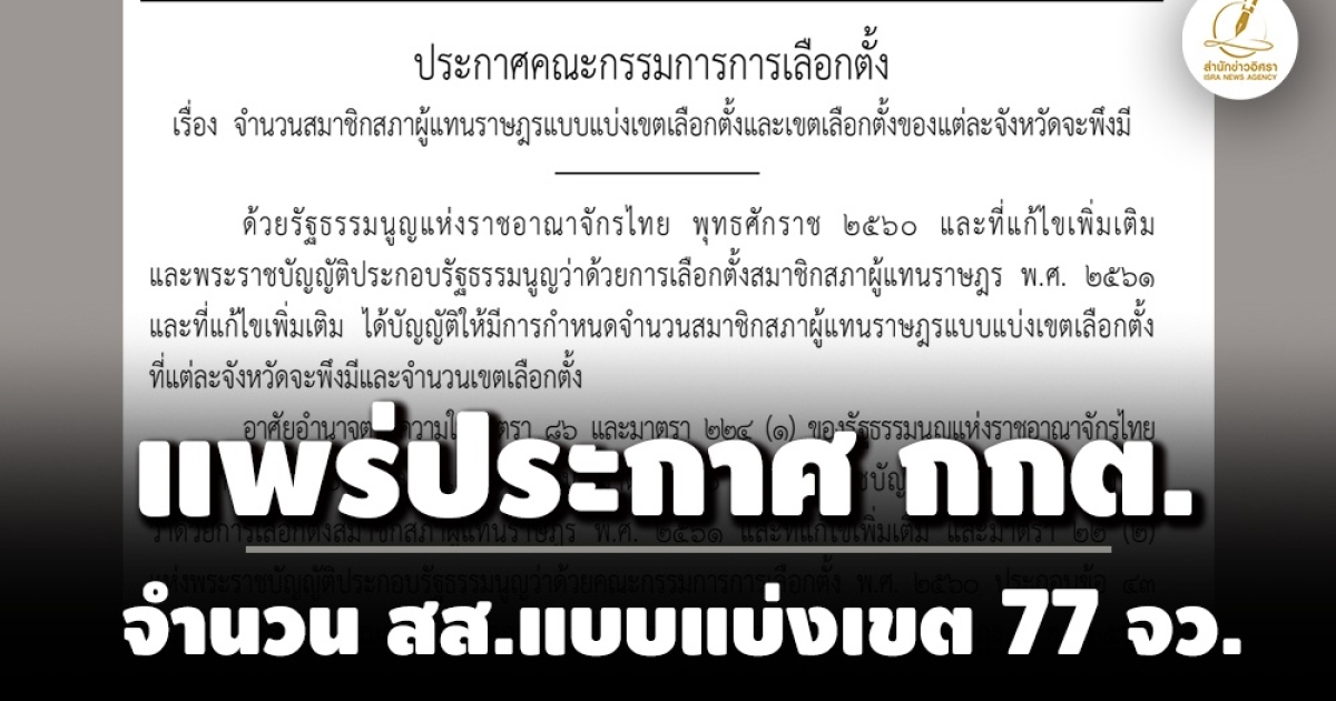 สำนักข่าวอิศรา (www.isranews.org) รายงานว่า เมื่อวันที่ 2 ธันวาคม 2568 ราชกิจจานุเบกษา ได้เผยแพร่ประกาศคณะกรรมการการเลือกตั้ง เรื่อง จำนวนสมาชิกสภาผู้แทนราษฎรแบบแบ่งเขตเลือกตั้งและเขตเลือกตั้งของแต่ละจังหวัดจะพึงมีแล้ว มีใจความว่าอาศัยอำนาจตามความในมาตรา 86 และมาตรา 224 (1) ของรัฐธรรมนูญแห่งราชอาณาจักรไทยพุทธศักราช 2560และที่แก้ไขเพิ่มเติม มาตรา 26 แห่งพระราชบัญญัติประกอบรัฐธรรมนูญว่าด้วยการเลือกตั้งสมาชิกสภาผู้แทนราษฎร พ.ศ. 2561 และที่แก้ไขเพิ่มเติม และมาตรา 22 (2)แห่งพระราชบัญญัติประกอบรัฐธรรมนูญว่าด้วยคณะกรรมการการเลือกตั้ง พ.ศ. 2560 ประกอบข้อ 43 ของระเบียบคณะกรรมการการเลือกตั้ง ว่าด้วยการเลือกตั้งสมาชิกสภาผู้แทนราษฎร พ.ศ. 2566 และประกาศสำนักทะเบียนกลาง เรื่อง จำนวนราษฎรทั่วราชอาณาจักร ตามหลักฐานการทะเบียนราษฎร ณ วันที่ 31 ธันวาคม 2567 ที่ประกาศในราชกิจจานุเบกษา เมื่อวันที่ 24 มกราคม 2568