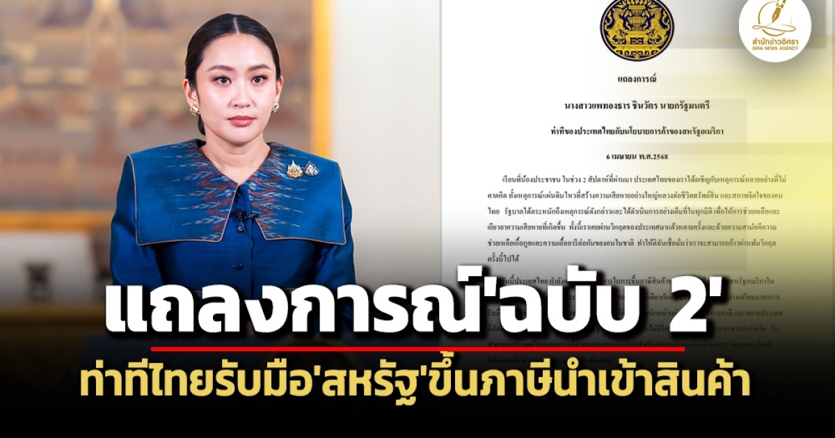 เมื่อวันที่ 6 เม.ย. น.ส.แพทองธาร ชินวัตร นายกรัฐมนตรี ออกแถลงการณ์ ‘ท่าทีของประเทศไทยกับนโยบายการค้าของสหรัฐอเมริกา’ ฉบับที่ 2 โดยมีเนื้อหาว่า “เรียนพี่น้องประชาชน ในช่วง 2 สัปดาห์ที่ผ่านมา ประเทศไทยของเราได้เผชิญกับเหตุการณ์หลายอย่างที่ไม่คาดคิด ทั้งเหตุการณ์แผ่นดินไหวที่สร้างความเสียหายอย่างใหญ่หลวงต่อชีวิตทรัพย์สิน และสภาพจิตใจของคนไทย