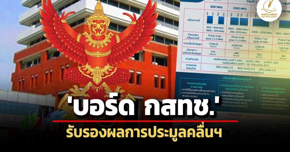 สำนักข่าวอิศรา (www.isranews.org) รายงานว่า เมื่อวันที่ 6 ก.ค. เวลา 9.30 น. คณะกรรมการกิจการกระจายเสียง กิจการโทรทัศน์ และกิจการโทรคมนาคมแห่งชาติ (บอร์ด กสทช.) นัดพิเศษ ที่มี ศ.คลินิก นพ.สรณ บุญใบชัยพฤกษ์ ประธาน กสทช. เป็นประธาน ได้ประชุมพิจารณารับรองผลการประมูลคลื่นความถี่ (Spectrum Auction) สำหรับกิจการโทรคมนาคมเคลื่อนที่สากล คลื่นความถี่ย่าน 850 MHz 1500 MHz 2100 MHz และ 2300 MHz