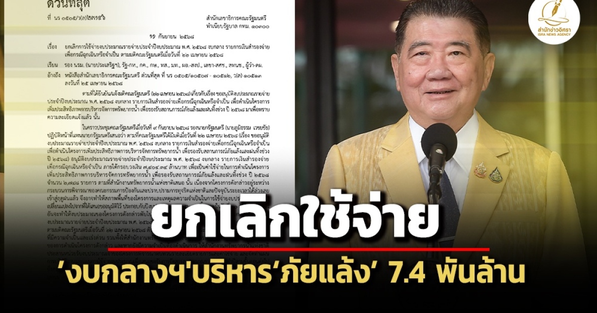 สำนักข่าวอิศรา (www.isranews.org) รายงานว่า ในการประชุมคณะรัฐมนตรี (ครม.) ที่มีนายภูมิธรรม เวชยชัย รองนายกรัฐมนตรี และรมว.มหาดไทย ปฏิบัติหน้าที่แทนนายกรัฐมนตรี เป็นประธานฯ เมื่อวันที่ 9 ก.ย.ที่ผ่านมา ที่ประชุม ครม. มีมติยกเลิกการใช้จ่ายงบประมาณรายจ่ายประจำปีงบประมาณ พ.ศ.2568 งบกลาง รายการเงินสำรองจ่ายเพื่อกรณีฉุกเฉินหรือจำเป็น ตามมติ ครม. เมื่อวันที่ 22 เม.ย.2568 ตามที่ นายภูมิธรรม เสนอ