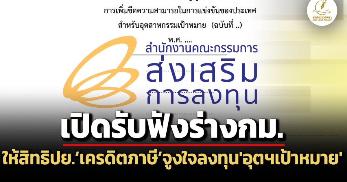 สำนักข่าวอิศรา (www.isranews.org) รายงานว่า เมื่อวันที่ 12 ก.ย.ที่ผ่านมา สำนักงานคณะกรรมการส่งเสริมการลงทุน ได้เปิดรับฟังความคิดเห็นต่อ ร่าง พ.ร.บ.การเพิ่มขีดความสามารถในการแข่งขันของประเทศสำหรับอุตสาหกรรมเป้าหมาย (ฉบับที่ ..) พ.ศ. .... โดยร่าง พ.ร.บ.ฉบับดังกล่าว เป็นร่าง พ.ร.บ.ฉบับที่ส่งให้สำนักงานคณะกรรมการกฤษฎีกาพิจารณา โดยจะเปิดรับฟังความคิดเห็นไปจนถึงวันที่ 29 ก.ย.2568
