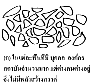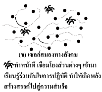 ความจริงในแต่ละพื้นที่มีบุคคล องค์กร สถาบันจำนวนมาก ที่ต่างคนต่างอยู่ ทำให้ไม่มีพลังสร้างสรรค์เกิดขึ้น ดัง (รูป ก.) ที่เหมือนสังคมไม่มีเซลล์สมอง และรูป (ข.) แสดงเซลล์สมองทางสังคมทำหน้าที่เชื่อมโยงส่วนต่างๆ เข้ามาเรียนรู้ร่วมกัน ทำให้เกิดพลั งสร้างสรรค์ไปสู่ความสำเร็จ