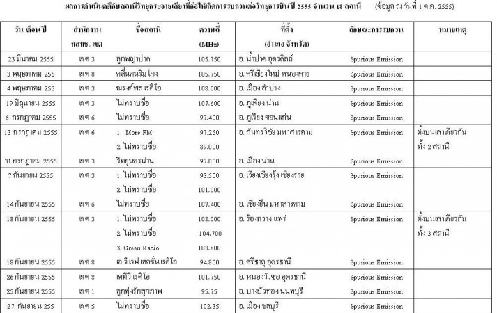10.ไม่ทราบชื่อ 101.0 อ.เวียงเชียงรุ้ง จ.เชียงราย 11.ไม่ทราบชื่อ 107.4 อ.เชียงยืน จ.มหาสารคาม 12.ไม่ทราบชื่อ 108.0 อ.ร้องกวาง จ.แพร่ 13.ไม่ทราบชื่อ 104.7 อ.ร้องกวาง จ.แพร่ 14.Green Radio 103.8 อ.ร้องกวาง จ.แพร่ 15.เอ จี เวฟ สเตชั่น เรดิโอ 94.8 อ.ศรีธาตุ จ.อุดรธานี 16.เคทีวี เรดิโอ 101.75 อ.หนองวัวซอ จ.อุดรธานี 17.ลูกทุ่งรักสุขภาพ 95.75 อ.บางบัวทอง จ.นนทบุรี และ18.ไม่ทราบชื่อ 102.35 อ.เมือง จ.ชลบุรี.