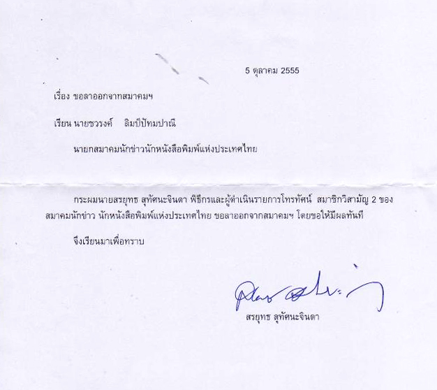 ล่าสุดวันที่ 5 ตุลาคม นายสรยุทธ สุทัศนะจินดา ยื่นหนังสือถึงนายชวรงค์ ลิมป์ปัทมปาณี นายกสมาคมนักข่าวนักหนังสือพิ