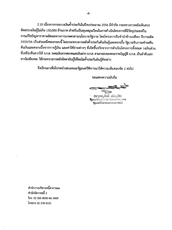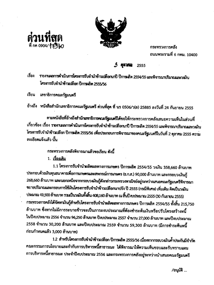 หมายเหตุ : เป็นรายละเอียดในหนังสือกระทรวงการคลัง นำเสนอต่อที่ประชุมคณะรัฐมนตรี (ครม.) เมื่อวันที่ 2 ตุลาคม 2555 ประกอบความเห็นวาระการพิจารณา เรื่อง รายงานผลการดำเนินการโครงการรับจำนำข้าวเปลือกนาปี ปีการผลิต 2554/2555 และพิจารณาปริมาณและวงเงินโครงการรับจำนำข้าวเปลือก ปีการผลิต 2555/56 ของกระทรวงพาณิชย์ สำนักข่าวอิศรา (www.isranews.org) เห็นว่ามีความน่าสนใจ จึงนำมาเสนอให้สาธารณชนได้รับทราบ