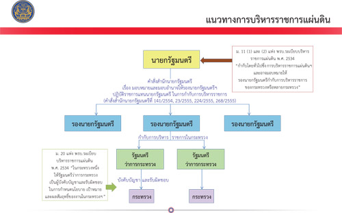 แผนภาพ (บทนำ) ระบุถึงภาพรวมแนวทางการบริหารราชการแผ่นดินของนายกรัฐมนตรี ในรูปของคำสั่งที่มอบหมายและมอบอำนาจให้รองนายกรัฐมนตรีฯ ปฏิบัติราชการแทนนายกรัฐมนตรี ในการกำกับการบริหารราชการ