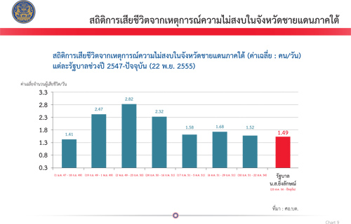 แผนภาพที่ 7 สถิติการเสียชีวิตจากเหตุการณ์ความไม่สงบในจังหวัดชายแดนภาคใต้ ช่วงระหว่างวันที่ 22 ส.ค.54-30 ธ.ค.51 อัตราการเสียชีวิตเฉลี่ยอยู่ที่ 1.52 คนต่อวัน แต่สมัยรัฐบาล น.ส.ยิ่งลักษณ์ ( 23 ส.ค.55-22 พ.ย.55) อัตราการเสียชีวิตลดลง เฉลี่ยอยู่ที่ 1.49 คนต่อวัน