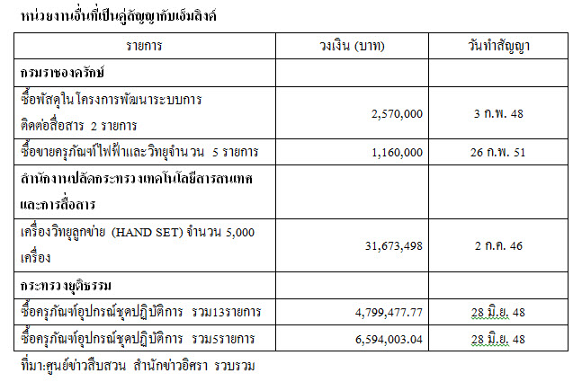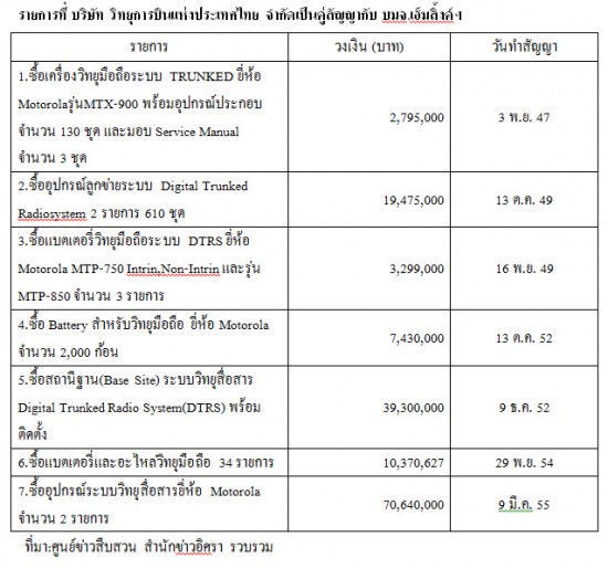 สำนักข่าวอิศรา www.isranews.org ตรวจสอบพบว่านับจากปี 2547 จนถึงเดือนมีนาคม 2555 บริษัท เอ็ม ลิ้งค์ เอเชีย คอร์ปอเรชั่น จำกัด (มหาชน) เป็นผู้จัดหาเครื่องมืออุปกรณ์วิทยุสื่อสารให้บริษัท วิทยุการบินแห่งประเทศไทย จำกัดทั้งสิ้น 7 สัญญา รวมวงเงิน 153,309,627 บาท ครั้งล่าสุดเกิดขึ้นวันที่ 9 มี.ค. 2555 ได้แก่ ซื้ออุปกรณ์ระบบวิทยุสื่อสารยี่ห้อ Motorola จำนวน 2 รายการ วงเงิน 70,640,000 บาท