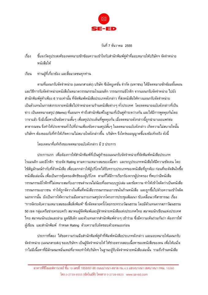 ผู้สื่อข่าวสำนักข่าวอิศรา (www.isranews.org) รายงานว่า ในช่วงบ่ายวันที่ 7 ธ.ค. บริษัท ซีเอ็ดยูเคชั่น จำกัด (มหาชน) ได้ออกแถลงการณ์มีความยาว 2 หน้ากระดาษ ถึงผู้ที่เกี่ยวข้องรวมถึงสื่อมวลชน เพื่อชี้แจงกรณีที่จดหมายซึ่งแผนกรับจัดจำหน่าย (แผนกสายส่ง) ทำถึงสำนักพิมพ์คู่ค้า 6 ราย เกี่ยวกับการรับจัดจำหน่ายหนังสือในหมวดวรรณกรรมโรแมนติก วรรณกรรมอิโรติก ที่เขียนในแบบจดหมายสรุป (memo) ด้วยข้อความสั้นๆ และเมื่อถูกนำมาเผยแพร่ต่อสาธารณชนก็ทำให้เกิดความไม่สบายใจ บริษัทซีเอ็ดฯขอชี้แจงถึงเจตนาที่แท้จริงของจดหมายดังกล่าว ใน 2 ประการ 1.ให้สำนักพิมพ์คู่ค้าช่วยจัดเรตติ้งความเหมาะสมของเนื้อหาและระบุประเภทหนังสือให้มีความชัดเจน เพื่อเป็นการคุ้มครองสิทธิผู้บริโภค เนื่องจากมีการร้องเรียนจากผู้ปกครอง ว่ามีวรรณกรรมอิโรติกที่ออกแบบรูปเล่มและข้อความทำให้เข้าใจผิดว่าเป็นวรรณกรมเยาวชน และถูกซื้อไปด้วยความเข้าใจผิด และ 2.ขอความร่วมมือจากสำนักพิมพ์คู่ค้า ให้ช่วยตรวจสอบเนื้อหาของหนังสือของตน เพื่อไม่ให้บริษัทซีเอ็ดฯในฐานะผู้รับจัดจำหน่ายต้องเข้าข่ายผิดกฎหมายที่เกี่ยวข้องกับการลามกอนาจาร
