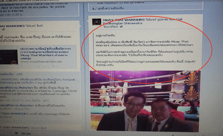 “แอดมิน” แฟน เพจ FACEBOOK MUAY THAI WARRIOR ได้มีการแชร์ลิงค์ข้อความจาก FACEBOOK ชื่อ Oak Panthongtae Shinawatra ซึ่งปรากฏรูปถ่ายระหว่าง นายพานทองแท้ ชินวัตร กับ พล.อ.ชัยสิทธิ์ ชินวัตร ประธานจัดการแข่งขันชกมวย