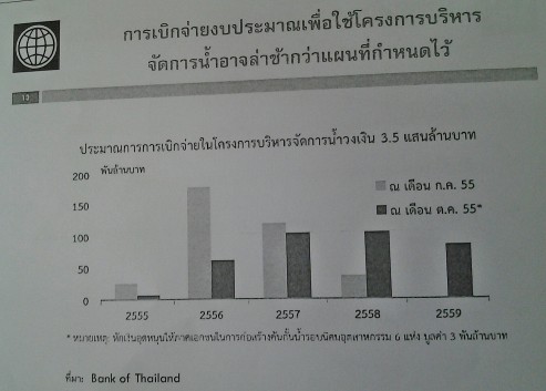 ทั้งนี้ ธนาคารโลก ได้ออกรายงานตามติดเศรษฐกิจไทย ระบุถึงการออก พ.ร.ก.กู้เงินเพื่อการวางระบบบริหารจัดการน้ำฯ ซึ่งเงินทุนดังกล่าว เป็นเงินนอกงบประมาณ เหมือนกับมาตรการกระตุ้นเศรษฐกิจปี 2552 (ไทยเข้มแข็ง 1 และ 2 ) ดังนั้นงบฯ ก้อนดังกล่าวจึงไม่ปรากฎอยู่ในดุลงบประมาณ แต่จะปรากฎอยู่ในหนี้สาธารณะ โดยธนาคารโลก พบว่า การเบิกจ่ายงบฯ เพื่อใช้ในโครงการบริหารจัดการน้ำของไทยนั้น ยังล่าช้ากว่าแผนที่กำหนดไว้ ทำให้การใช้จ่ายเงินในประเทศลดลง มีผลต่อการกระตุ้นเศรษฐกิจในประเทศ ปี 2556