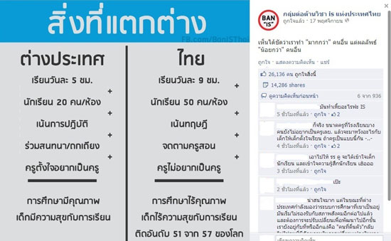 อาทิ ต่างประเทศเรียนวันละ 5 ชม. , นักเรียน 20 คน/ห้อง , เน้นการปฏิบัติ , ร่วมสนทนา/ถกเถียง , ครูตั้งใจอยากเป็นครู ผลคือ การศึกษามีคุณภาพเด็กมีความสุขกับการเรียน ส่วนไทย เรียนวันละ 9 ชม. , นักเรียน 50 คน/ห้อง , เน้นทฤษฎี , จดตามครูสอน , ครูไม่อยากเป็นครู ผลคือ การศึกษาไร้คุณภาพเด็กไร้ความสุขกับการเรียน ติดอันดับ 51 จาก 57 ของโลก