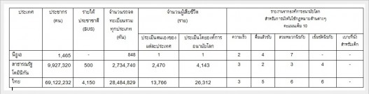 อันดับ 3 ประเทศไทย มียานพาหนะจดทะเบียน (ข้อมูลก่อนนโยบายรถคันแรก) เป็นรถยนต์ 4 ล้อ 9,887,706 คัน รถ 2 ล้อ และ 3 ล้อ จำนวน 17,322,538 คัน รถบรรทุกหนัก 816,844 คัน รถบัส 137,943 คัน อื่นๆ 319,798 คัน จำนวนผู้เสียชีวิตตามรายงาน 13,766 คน เป็นชาย 79% หญิง 21% ความสูญเสียทางเศรษฐกิจ 3% ของ GDP