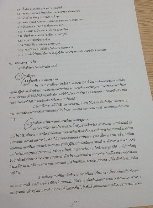 ประการที่หนึ่ง (ตามข้อ 4.1) การทำการศึกษา โดยทำการศึกษาถึงความเหมาะสมของโครงการ การวิเคราะห์ผลกระทบสิ่งแวดล้อม สังคม สุขภาพ ซึ่งอาจก่อให้เกิดผลกระทบต่อชุมชนอย่างร้ายแรง ในกรณีที่หากโครงการใดๆ ก็ตามในโมดูลนี้อยู่ในข่ายที่ต้องจัดทำรายการผลกระทบสิ่งแวดล้อมเบื้องต้น (IEE) หรือรายงานการวิเคราะห์ผลกระทบสิ่งแวดล้อม (EIA) หรือรายงานวิเคราะห์ผลกระทบสิ่งแวดล้อมสำหรับโครงการหรือกิจการที่อาจก่อให้เกิดผลกระทบต่อชุมชนอย่างรุนแรง ทั้งด้านคุณภาพสิ่งแวดล้อม ทรัพยากรธรรมชาติและสุขภาพ (EHA) ตามพ.ร.บ.สิ่งแวดล้อม 2535 และข้อกำหนดหรือกฎหมายหรือประกาศระเบียบต่างๆ ที่เกี่ยวข้อกับสิ่งแวดล้อม รวมถึงมติคณะรัฐมนตรีต่างๆ ที่เกี่ยวข้องผู้รับจ้างต้องดำเนินการศึกษาผลกระทบดังกล่าวข้างต้น รวมทั้งต้องจัดทำมาตรฐานป้องกันแก้ไขและลดผลกระทบสิ่งแวดล้อม และแผนติดตามตรวจสอบผลกระทบสิ่งแวดล้อม (EIMP) ทั้งนี้แผนการแก้ไขและบรรเทาผลกระทบด้านต่างๆ มุ่งให้มีผลกระทบต่อสิ่งแวดล้อมและสังคมให้น้อยที่สุด และเมื่อทำการศึกษาแล้วเสร็จต้องได้รับความเห็นชอบตามขั้นตอนของกฎหมายแล้วจึงดำเนินการตามแผนแก้ไขและบรรเทาผลกระทบด้านต่างๆ