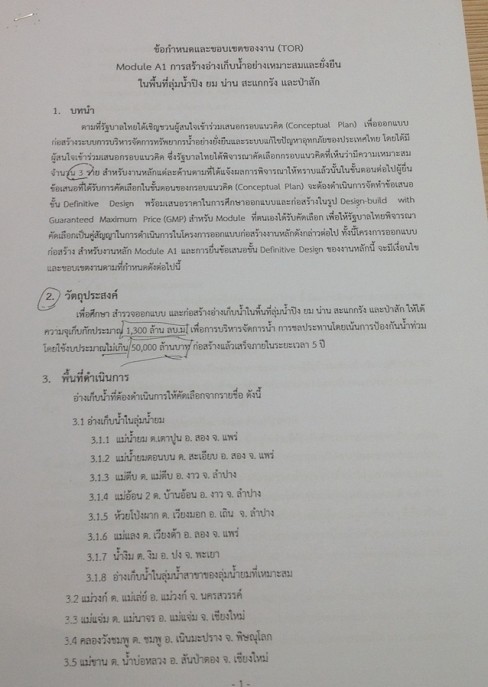 ประการที่สอง ตามข้อ 4.2 การออกแบบ กำหนดให้ผู้รับจ้างต้องดำเนินการสำรวจ ออกแบบ หรือทบทวนรายละเอียดตามผลการศึกษาที่ได้ทำการศึกษา เพื่อให้ได้รูปแบบโครงสร้างและรายละเอียดต่างๆ ตามวัตถุประสงค์ โดยอย่างน้อยต้องประกอบด้วยรายละเอียดของตัวเขื่อน อาคารระบายน้ำล้น อาคารท่อส่งน้ำ และอาคารประกอบอื่นๆ เพื่อใช้ส่งน้ำในการชลประทาน การอุปโภค การรองรับการผลิตไฟฟ้าพลังน้ำหากมีศักยภาพและมีความจำเป็นในภายหลัง