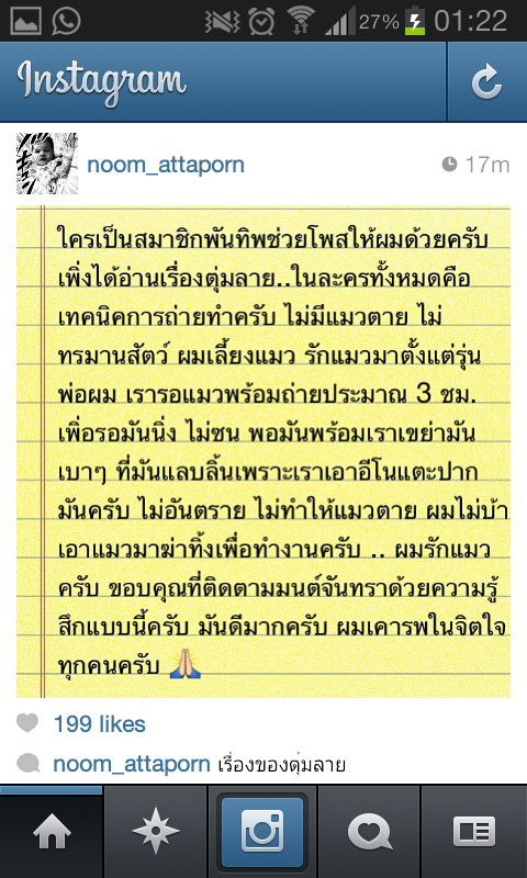 "ใครเป็นสมาชิกพันทิปช่วยโพสต์ให้ผมด้วยครับ เพิ่งได้อ่านเรื่องตุ่มลาย ในละครทั้งหมดคือเทคนิคการถ่ายทำ ไม่มีแมวตาย ไม่ทรมานสัตว์ ผมเลี้ยงแมว รักแมวมาตั้งแต่รุ่นพ่อผม เรารอแมวพร้อมถ่ายประมาณ 3 ชั่วโมง เพื่อรอมันนิ่ง ไม่ซน พอมันพร้อมเราเขย่ามันเบา ๆ ที่มันแลบลิ้นเพราะเราเอาอีโนแตะปากมันครับ ไม่อันตราย ไม่ทำให้แมวตาย ผมไม่บ้าเอาแมวมาฆ่าทิ้งเพื่อทำงานครับ ผมรักแมวครับ ขอบคุณที่ติดตามมนต์จันทราด้วยความรู้สึกแบบนี้ครับ มันดีมาก ผมเคารพในจิตใจทุกคนครับ" หนุ่ม อรรถพร ระบุชัดเจน