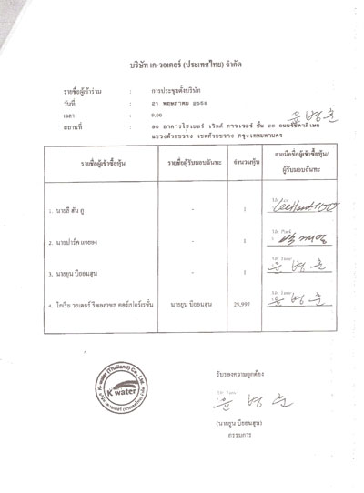 สำนักข่าวอิศรา www.isranews.org ตรวจสอบข้อมูลกับกรมพัฒนาธุรกิจการค้าพบว่า บริษัท เค-วอเตอร์ (ประเทศไทย) จำกัด ชื่อภาษาอังกฤษ (K-water (Thailand) Co,LTD. ได้ประชุมตั้งบริษัทเมื่อวันที่ 21 พฤษภาคม 2555 เวลา 9.00 น. ณ เลขที่ 90 อาคารไซเบอร์ เวิลด์ ทาวเวอร์ ชั้น 26 ถนนรัชดาภิเษก แขวงห้วยขวาง เขตห้วยขวาง กรุงเทพฯ มีผู้เข้าชื่อซื้อหุ้นเข้าร่วมประชุม ได้แก่