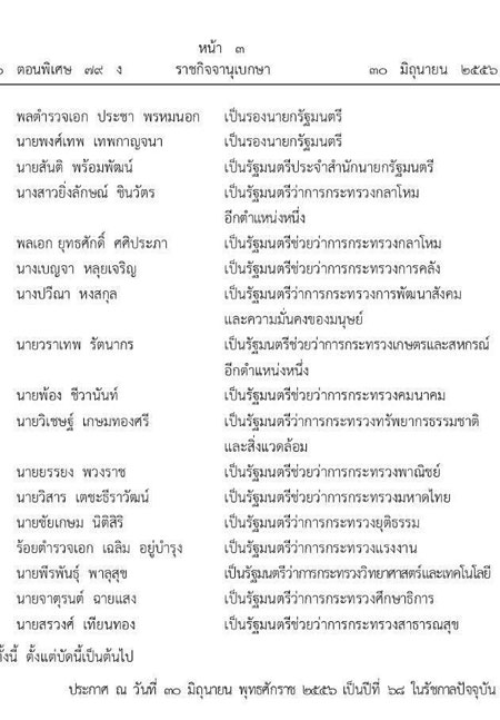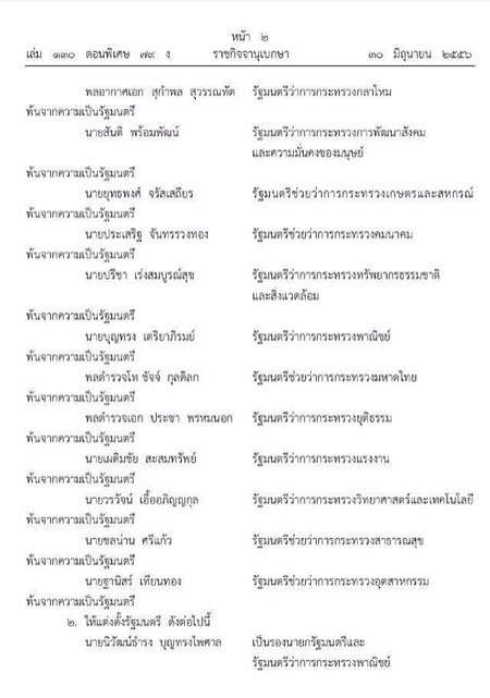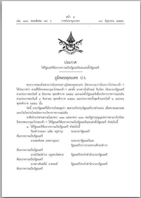 ผู้สื่อข่าวสำนักข่าวอิศรา www.isranews.org รายงานว่า ในช่วงเย็นวันที่ 30 มิถุนายน 2556 ราชกิจจานุเบกษา ได้เผยแพร่พระบรมราชโองการ ประกาศให้รัฐมนตรีพ้นจากความเป็นรัฐมนตรีและแต่งตั้งรัฐมนตรี รัฐบาล น.ส.ยิ่งลักษณ์ ชินวัตร 5 มีรายละเอียดดังต่อไปนี้
