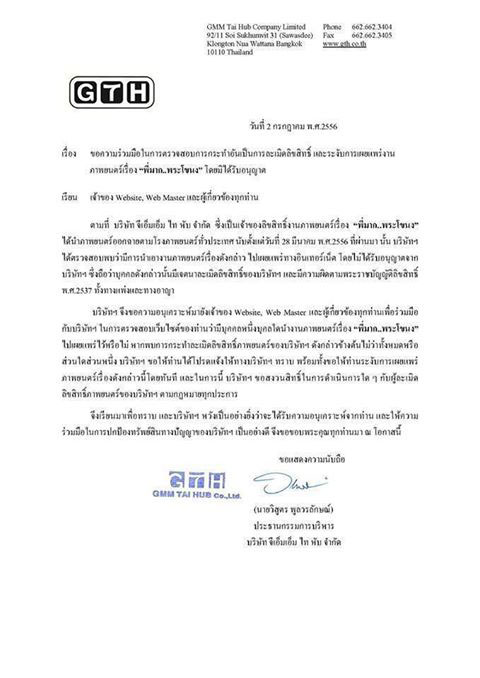 โดยในหนังสือแจ้งเตือนของ บริษัท จีเอ็มเอ็มไท หับ จำกัด ลงวันที่ 2 กรกฎาคม 2556 ระบุว่า “ ตามที่บริษัท จีเอ็มเอ็ม ไท หับ จำกัด ซึ่งเป็นเจ้าของสิทธิ์งานภาพยนตร์เรื่อง “พี่มาก..พระโขนง” ได้นำภาพยนตร์ออกฉายตามโรงภาพยนตร์ทั่วประเทศ นับตั้งแต่วันที่ 28 มีนาคม 2556 ที่ผ่านมา นั้น บริษัทฯ ได้ตรวจสอบพบว่ามีการนำเอางานภาพยนตร์เรื่องดังกล่าวไป เผยแพร่ทางอินเทอร์เน็ต โดยไม่ได้อนุญาตจากบริษัทฯ ถือว่าบุคคลดังกล่าวมีเจตนาละเมิดลิขสิทธิ์ของบริษัทฯ และมีความผิดตามพระราชบัญญัติลิขสิทธิ์ พ.ศ. 2537 ทั้งทางแพ่งและทางอาญา”