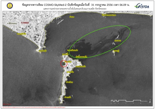 วันที่ 31 กรกฎาคม สำนักงานพัฒนาเทคโนโลยีอวกาศและภูมิสารสนเทศ (องค์การมหาชน) หรือ GISTDA เผยภาพจากดาวเทียมระบบเรดาร์ COSMO-SkyMed-2 เมื่อเวลา 06.09 น.โดยแสดงให้เห็นอาณาบริเวณของคราบน้ำมันที่เป็นฟิล์มบางๆ ที่ยังมีอยู่ทางด้านเหนือของเกาะเสม็ด ซึ่งมีขนาดลดลงจากเมื่อวานนี้เล็กน้อย (ประมาณ 10 ตารางกิโลเมตร) และมีการกระจายตัวของฟิล์มน้ำมันบางส่วนทางทิศตะวันตกเฉียงเหนือของเกาะเสม็ด โดยฟิล์มน้ำมันเหล่านี้น่าจะมีต้นกำเนิดมาจากมวลน้ำมันที่สะสมบริเวณด้านเหนือของอ่าวเสม็ด ซึ่งควรจะมีการสำรวจภาคพื้นดินอย่างละเอียดและขจัดออกด้วยวิธีการที่เหมาะสม เพื่อลดปริมาณต้นกำเนิดของคราบน้ำมัน มิฉะนั้นก็จะยังมีการแพร่ออกมาอย่างต่อเนื่องไปอีกหลายวันหรือสัปดาห์