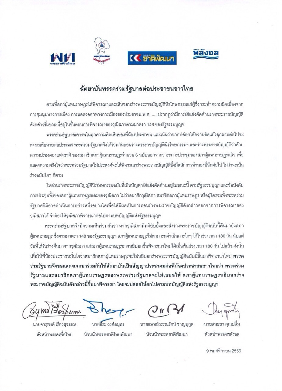 เมื่อวันที่ 9 พฤศจิกายน 2556 ที่พรรคเพื่อไทย หัวหน้าพรรคร่วมรัฐบาล 4 พรรค ประกอบด้วย นายจารุพงศ์ เรืองสุวรรณ หัวหน้าพรรคเพื่อไทย (พท.) นายธีระ วงศ์สมุทร หัวหน้าพรรคชาติไทยพัฒนา (ชทพ.) นพ.วรรณรัตน์ ชาญนุกูล หัวหน้าพรรคชาติพัฒนา (ชพน.) และนายสนธยา คุณปลื้ม หัวหน้าพรรคพลังชล (พช.) ได้ลงนามเป็นสัตยาบันในแถลงการณ์ร่วมกัน มีใจความว่า ภายหลังมีการถอนร่าง พ.ร.บ.นิรโทษกรรมและร่าง พ.ร.บ.ปรองดอง รวมทั้ง 6 ฉบับออกจากวาระการประชุมสภาผู้แทนราษฎร ว่าจะไม่มีการพิจารณาร่าง พ.ร.บ.ซึ่งมีหลักการทำนองนี้อีกต่อไป ไม่ว่าจะเป็นร่างฉบับใดๆ ก็ตาม