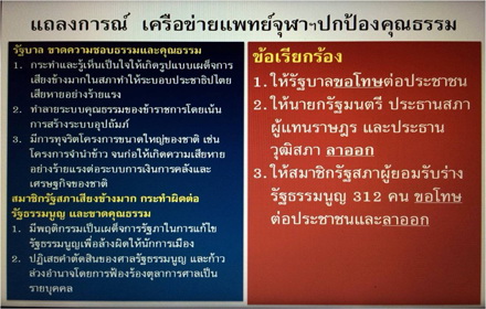 เครือข่ายแพทย์จุฬาฯ ปกป้องคุณธรรม ชี้รบ.ต่อต้านคำสั่งศาลรธน.เท่ากับใช้อำนาจแทรกแซงตุลาการ จี้นายกฯ-ปธ.สภา-ปธ.วุฒิฯ-ส.ส. 312 คน ออกมาขอโทษและลาออก