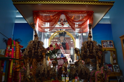 ขณะที่บริเวณรอบ ๆ เต็มไปด้วยภาพถ่ายในอดีตของหล่อนให้หวนคิดถึงความทรงจำครั้งก่อนเก่า อีกทั้งยังมีโต๊ะเครื่องแป้ง เสื้อผ้า รองเท้าส้นสูง ซึ่งส่วนใหญ่จะเป็นสีแดงตามที่หล่อนชอบตั้งเรียงรายไว้ คาดว่าอาจจะเป็นของไหว้แก้บนจากบรรดาแฟนเพลง แต่ต้องขอบอกว่าหากใครต้องการจะขอพรจะต้องจุดธูป 9 ดอก ซึ่งทางวัดได้จัดเตรียมไว้ในกราบไหว้กันด้านนอกแล้ว