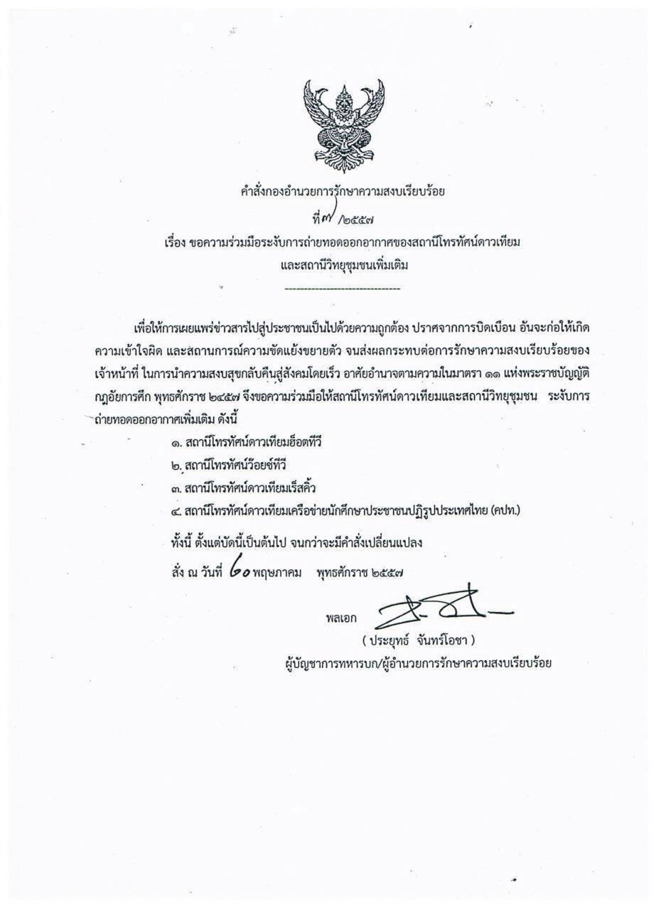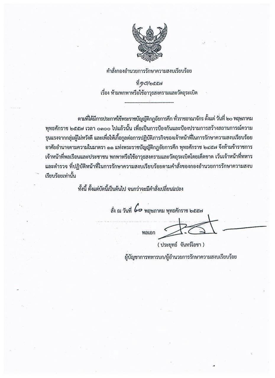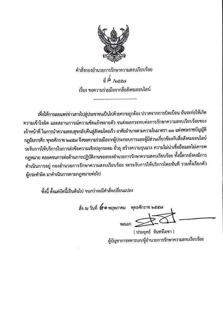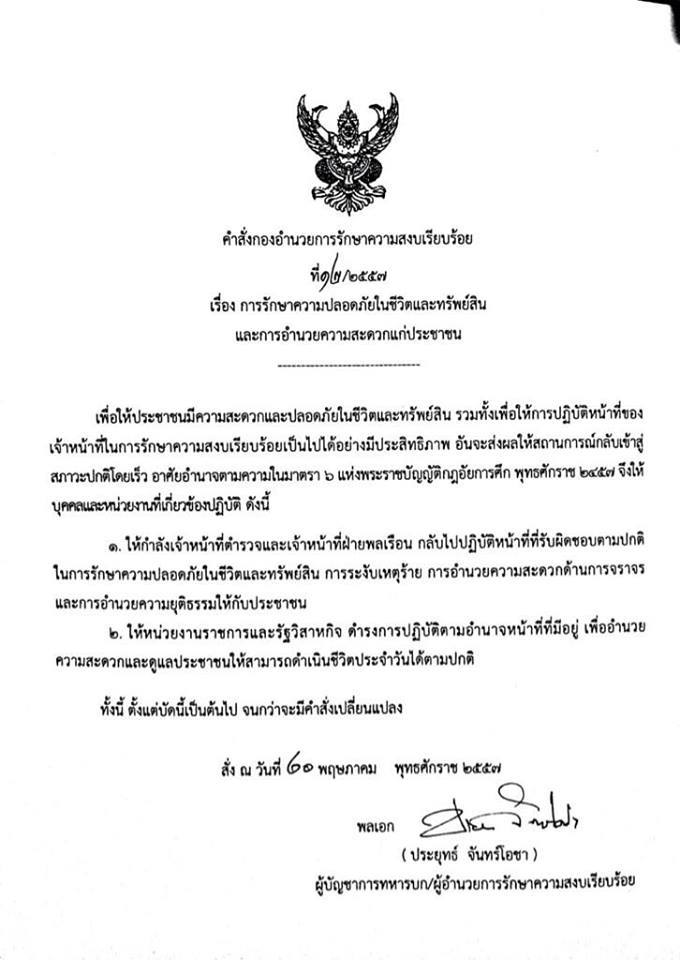 หมายเหตุ : เมื่อเวลา 03.00 น. ของวันที่ 20 พฤษภาคม 2557 ที่ผ่านมา พลเอกประยุทธ์ จันทร์โอชา ผู้บัญชาการทหารบก ได้ออกประกาศกองทัพบก ฉบับที่ 1/2557 เรื่องการประกาศใช้พระราชบัญญัติกฎอัยการศึก และมีคำสั่งให้ศูนย์อำนวยการรักษาความเรียบร้อย (ศอ.รส.) ยุติหน้าที่ในทันที