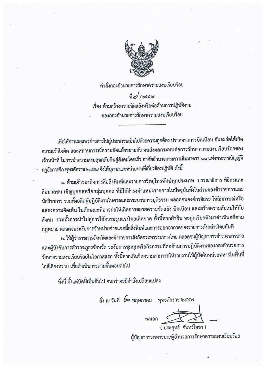ดูชัดๆ ประกาศกฎอัยการศึก ฉบับ "พลเอกประยุทธ์ จันทร์โอชา" ผู้บัญชาการทหารบก สั่ง ศอ.รส. ยุติหน้าที่ ตั้ง กอ.รส.ดูแลแทน ย้ำ ขอให้ทุกกลุ่มทุกฝ่ายหยุดการเคลื่อนไหว
