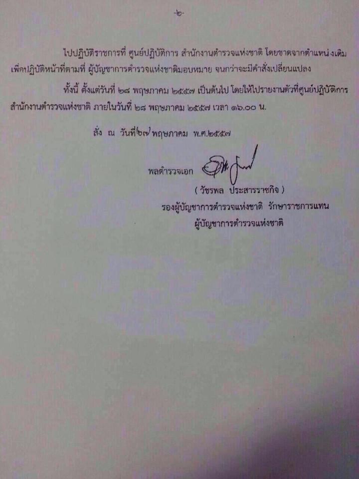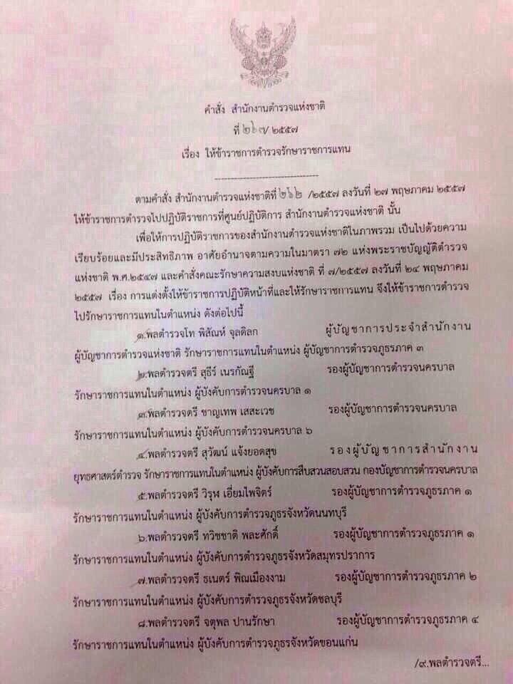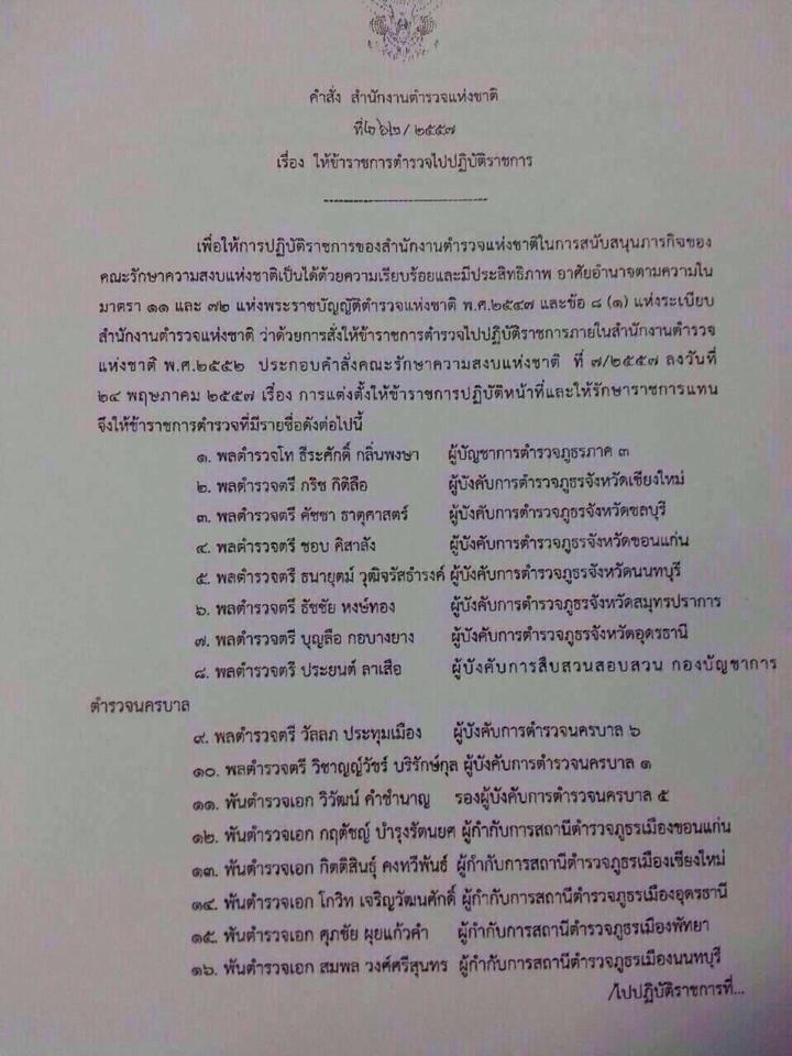 ผู้สื่อข่าวสำนักข่าวอิศรา www.isranews.org รายงานว่า เมื่อวันที่ 27 พ.ค.ที่ผ่านมา พลตำรวจเอก วัชรพล ประสารราชกิจ รองผู้บัญชาการตำรวจแห่งชาติ รักษาราชการแทนผู้บัญชาการตำรวจแห่งชาติ ได้ลงนามในคำสั่งโยกย้ายนายตำรวจระดับสูง ในต่างจังหวัด จำนวน 16 ราย อาทิ เชียงใหม่ ชลบุรี ขอนแก่น นนทบุรี สมุทรปราการ อุดรธานี เข้ามาปฏิบัติหน้าที่ตามคำสั่งผู้บัญชาการตำรวจแห่งชาติที่ส่วนกลาง โดยให้ไปรายงานตัวที่ศูนย์ปฏิบัติการสำนักงานตำรวจแห่งชาติ ในวันที่ 28 พ.ค.นี้ เวลา 16.00 น. พร้อมลงนามในคำสั่งแต่งตั้งนายตำรวจ เข้ารักษาราชการแทน