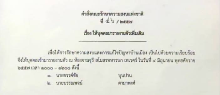 เมื่อวันที่ 3 มิถุนายน คณะรักษาความสงบแห่งชาติ (คสช.) มีคำสั่งฉบับที่ 46 ให้บุคคลเข้ารายงานตัวเพิ่มเติม ได้แก่ นายขรรค์ชัย บุนปาน ประธานกรรมการ บริษัท มติชน จำกัด (มหาชน) และนายบรรณพจน์ ดามาพงศ์ พี่บุญธรรมคุณหญิงพจนมาน ชินวัตร เข้ารายงานตัวพรุ่งนี้ (4 มิถุนายน) เวลา 10.00-12.00 น. ณ ห้องจามจุรี สโมสรทหารบก