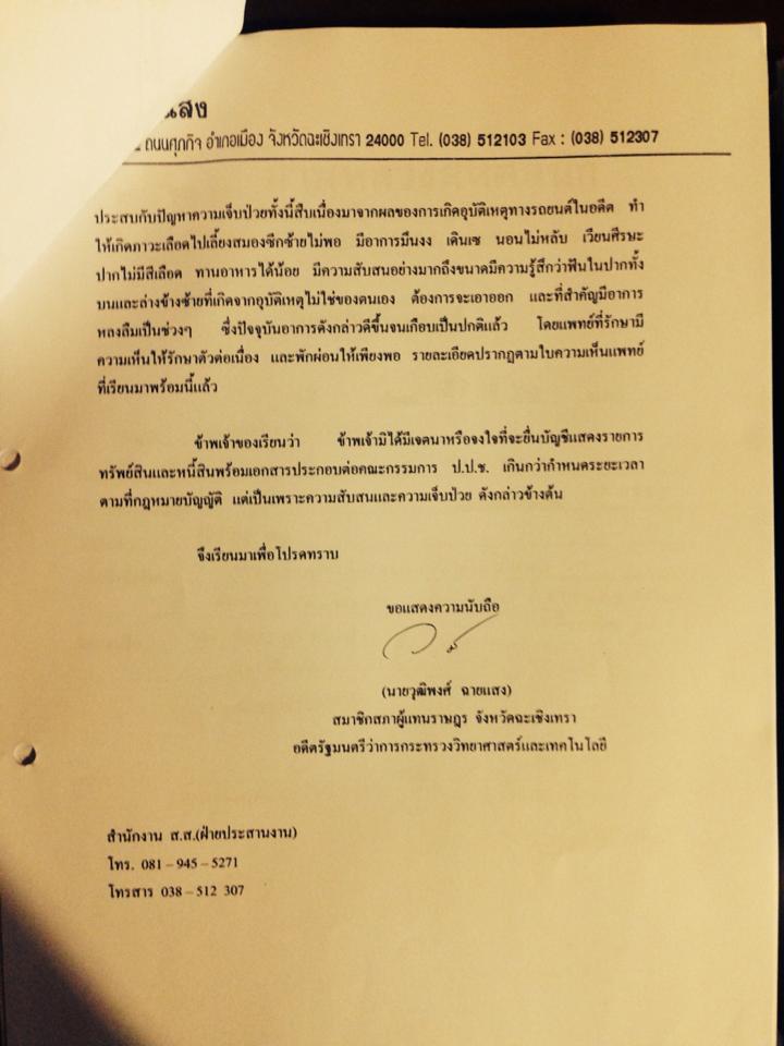 "ประกอบกับในห้วงเวลาที่กำหนดให้ยื่นบัญชีทรัพย์สินฯ กรณีครบ 1 ปี ดังกล่าว (25 กันยายน 2552 -24 ตุลาคม 2552) อยู่ในช่วงที่ข้าพเจ้า ประสบกับปัญหาความเจ็บป่วย ทั้งนี้ สืบเนื่องจากผลของการเกิดอุบัติเหตุทางรถยนต์ในอดีต ทำให้เกิกภาวะเลือดไปเลี้ยงสมองซีกซ้ายไม่พอ มีอาการมึนงง เดินเซ นอนไม่หลับ เวียนศีรษะ ปากไม่มีสีเลือด ทานอาหารได้น้อย มีความสับสนอย่างมากถึงขนาดมีความรู้สึกว่าฟันในปากทั้งบนและล่างข้างซ้ายที่เกิดจากอุบัติเหตุไม่ใช่ของตนเอง ต้องการจะเอาออก และที่สำคัญมีอาการหลงลืมเป็นช่วงๆ ซึ่งปัจจุบันอาการดังกล่าวดีขึ้นจนเกือบเป็นปกติแล้ว โดยแพทย์ที่รักษามีความเห็นให้รักษาต่อเนื่อง และพักผ่อนให้เพียงพอ"