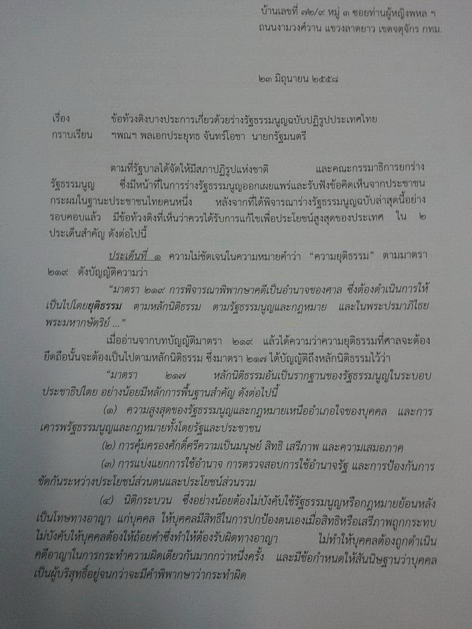 หนังสือของนายธานินทร์ ลงวันที่ 23 มิถุนายน 2558 และได้ส่งถึงนายกรัฐมนตรีไปแล้วเมื่อวันที่ 25 มิถุนายนที่ผ่านมา โดยระบุตอนต้นว่าเขียนในนามประชาชนไทยคนหนึ่ง
