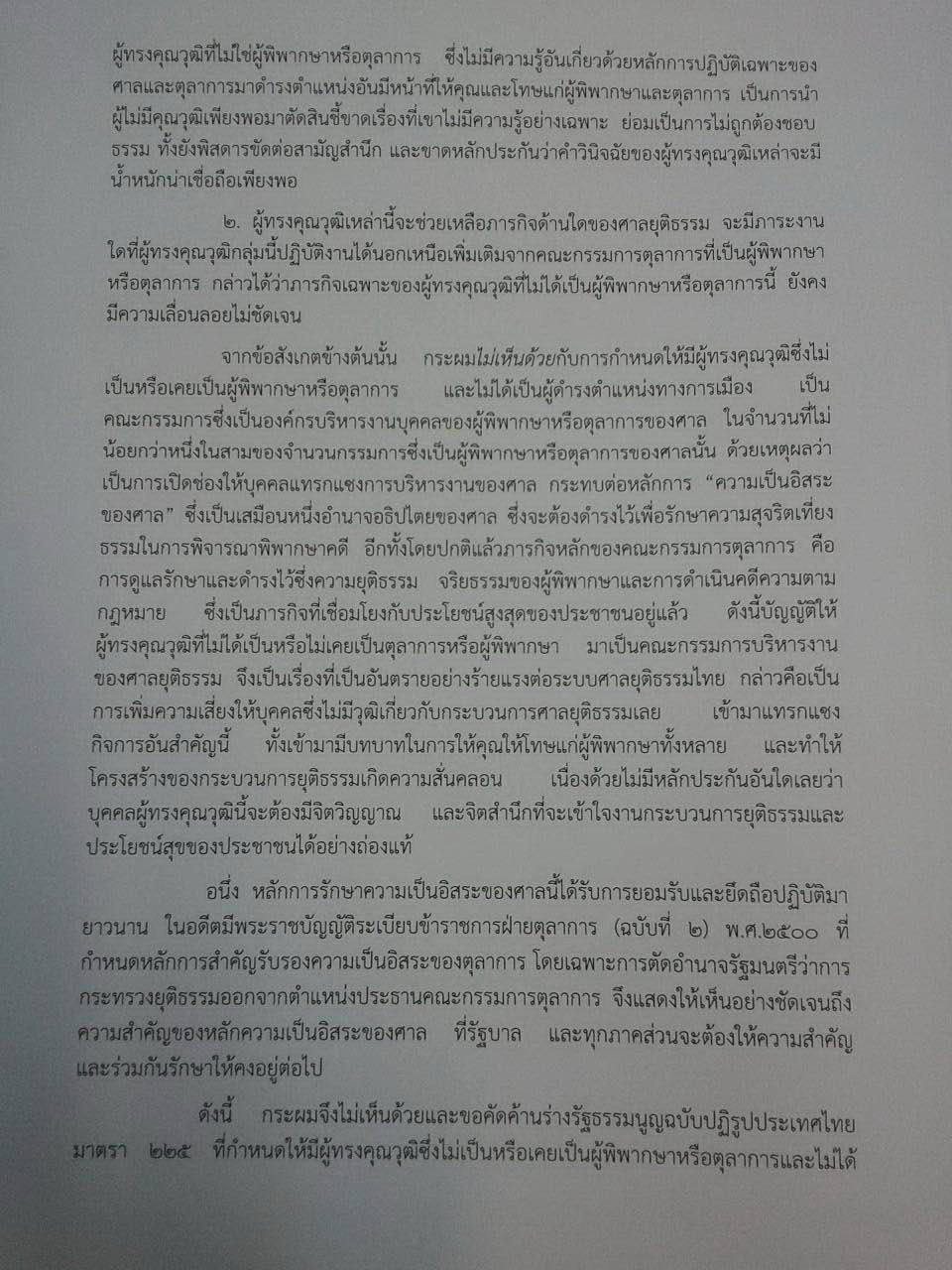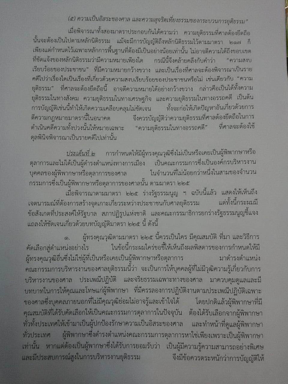 2.การกำหนดให้มีผู้ทรงคุณวุฒิซึ่งไม่เป็นหรือเคยเป็นผู้พิพากษาหรือตุลาการ และไม่ได้เป็นผู้ดำรงตำแหน่งทางการเมือง เป็นคณะกรรมการซึ่งเป็นองค์กรบริหารงานบุคคลของผู้พิพากษาหรือตุลาการของศาล ในจำนวนไม่น้อยกว่าหนึ่งในสามของจำนวนกรรมการซึ่งเป็นผู้พิพากษาหรือตุลาการของศาลนั้น ตามมาตรา 225 ของร่างรัฐธรรมนูญ