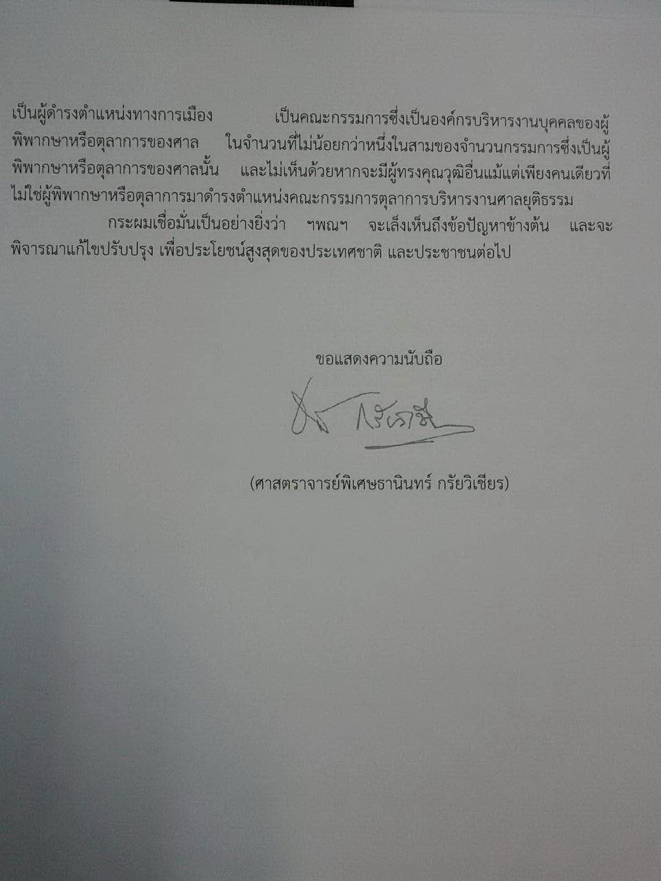 นายธานินทร์ กรัยวิเชียร องคมนตรี และอดีตนายกรัฐมนตรี ได้ทำหนังสือถึง พลเอกประยุทธ์ จันทร์โอชา นายกรัฐมนตรีและหัวหน้าคณะรักษาความสงบแห่งชาติ คัดค้านร่างรัฐธรรมนูญฉบับใหม่ในหมวดที่แก้ไขหลักการเกี่ยวกับศาลยุติธรรม