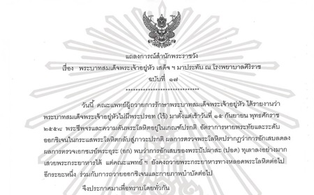 ขณะนี้พระบาทสมเด็จพระเจ้าอยู่หัว ยังคงมีพระปรอท (ไข้) ความดันพระโลหิตอยู่ในเกณฑ์ปรกติ เสวยพระสุธารส (น้ำ) ได้บ้าง