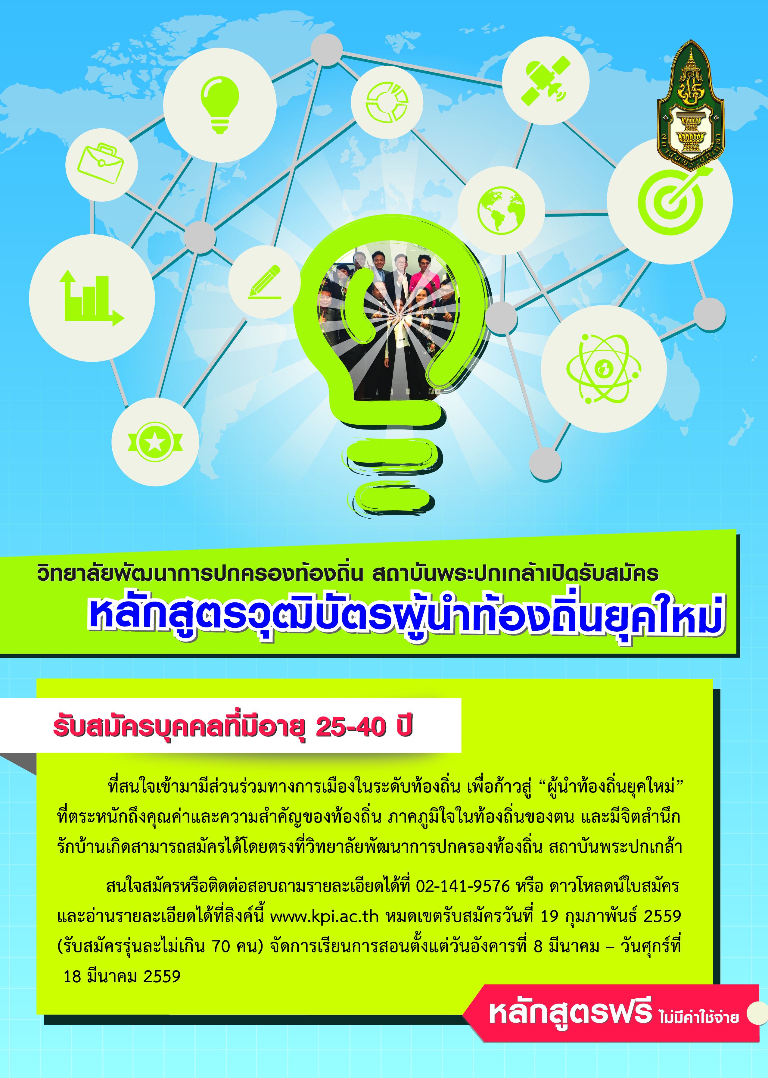 สถาบันพระปกเกล้า โดยวิทยาลัยพัฒนาการปกครองท้องถิ่นได้เปิดรับสมัครผู้สนใจเข้ารับการศึกษาอบรม “หลักสูตรวุฒิบัตรผู้นำท้องถิ่นยุคใหม่ รุ่น 3” จำนวน 70 คน (ไม่เสียค่าลงทะเบียนเข้ารับการอบรม) โดยมีวัตถุประสงค์เพื่อส่งเสริมคนรุ่นใหม่มีความรู้ ความเข้าใจในการบริหารงานท้องถิ่นให้ทันกับสถานการณ์ ความท้าทายใหม่ๆ และความเปลี่ยนแปลงที่เกิดขึ้นได้อย่างมีประสิทธิภาพ รวมทั้งได้ตระหนักถึงคุณค่า ความสำคัญและความภาคภูมิใจในท้องถิ่นของตน พร้อมที่จะเข้ามามีส่วนร่วมในการบริหารพัฒนาท้องถิ่นด้วยจิตสำนึกรักบ้านเกิด