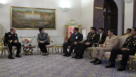 บรรยายใต้ภาพ: 5 มิถุนายน 2555 พลเอก Martin E.Dempsey ประธานคณะเสนาธิการทหารร่วมสหรัฐอเมริกา เข้าเยี่ยมคารวะนายกรัฐมนตรี ณ ห้องสีม่วง ตึกไทยคู่ฟ้า
