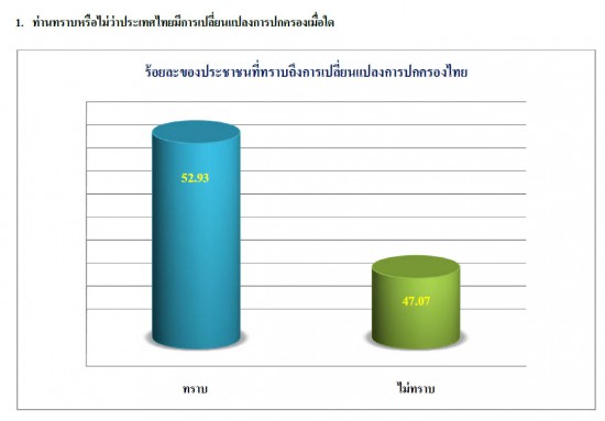 ความเห็นประชาชน เรื่อง "80ปี แห่งการเปลี่ยนแปลงการปกครอง" สำรวจระหว่างวันที่ 9-17 มิ.ย. 2555 โดนสำรวจจากประชาชนทั่วกรุงเทพฯ จำนวน 1,196 หน่วยตัวอย่าง ผลการสำรวจสรุปได้ดังนี้